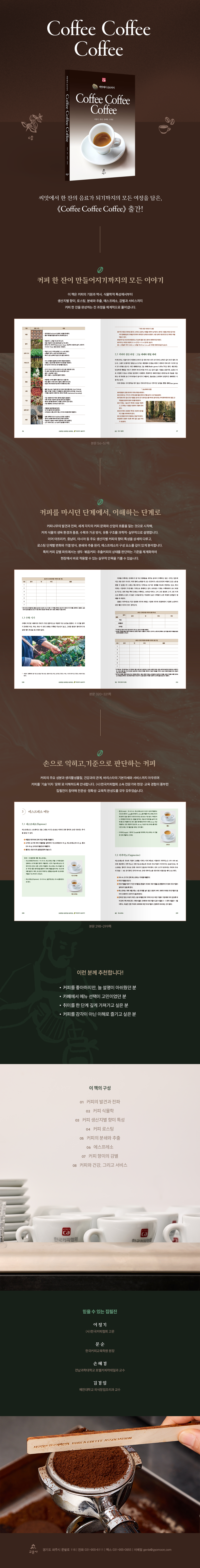 (사)한국커피협회 소속 전문가와 현장·교육 경험이 풍부한 집필진이 참여해 전문성·정확성·교육적 완성도를 모두 갖춘 이 책은 커피 전공자, 바리스타, 로스터, 커피 산업 종사자는 물론 커피를 깊이 있게 이해하고 싶은 일반 독자에게도 든든한 길잡이가 될 것이다.